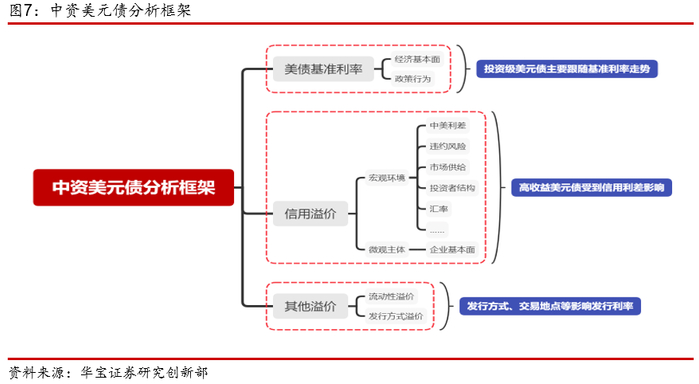 上文统计了目前QDII债基的具体投向,中资美元债、美国国债是主流标的,尤其分析中资美元债在分析QDII债基时尤为重要。中资美元债可以看成“混血儿”,其流动性在全球,但信用基本面在境内,其定价具备内外联动的特点。简单对美元债收益率进行分解,美元债收益率=定价基准(同期限美债利率)+信用溢价+其他溢价(流动性溢价、发行方式溢价等)。