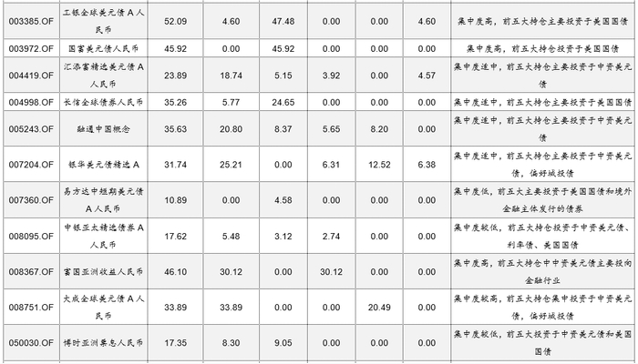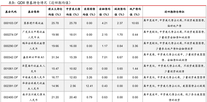(2)券种分布:相比普通债基,QDII债基所投资产范围分化更大,不同QDII债基主要投资于不同类型债券。中资美元债、美国国债分别是QDII债基第一、第二大持仓券种,两者在前五大持仓中常常呈现“此消彼长”的关系。我们根据近四期QDII债基中资美元债、美国国债占前五大债券比例均值对QDII债基进行进一步分类:其中,“中资美元债占比均值≥50%”为“中资美元债占比高”,“美国国债占比均值≥50%”为“美国国债占比高”。在“其他”分类中,易方达中短期美元债A人民币前五大持仓中中资美元债和美国国债占比较低,基金经理更加偏好境外金融机构发行的债券;中银亚太精选债券A人民币、博时亚洲票息人民币两只基金的中资美元债和美国国债持仓较为均衡。