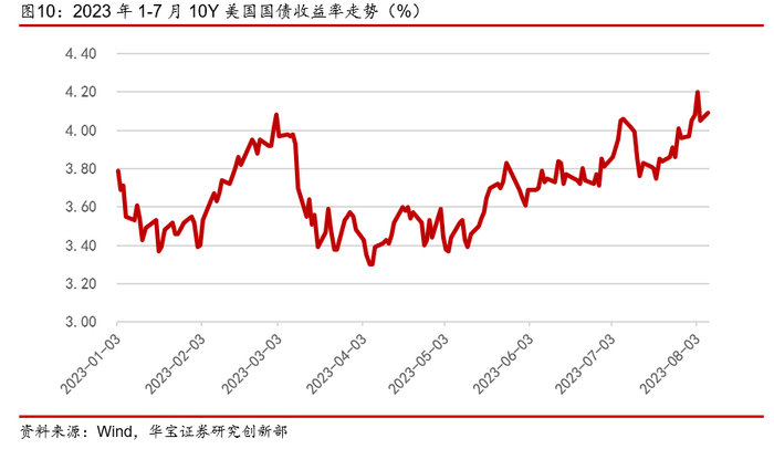 (4)2023.4.7—2023.7.7:4月,欧美银行业危机暂时缓解,3月就业数据仍具韧性,市场对于5月加息25BP的预期升温,10Y美债收益率震荡上行;5月公布的美国非农数据显示美国就业市场超预期强劲,且失业率回落至低位,市场对于加息预期进一步升温,10Y美债收益率不断上行至3.83%;6月,CPI数据显示美国通胀温和回落,但美联储表态仍然偏鹰,美债利率在多空博弈中震荡上行至4.06%。7月公布的美国6月就业、经济及通胀数据均超出市场预期,7月如期加息25bp,美债利率继续走高。