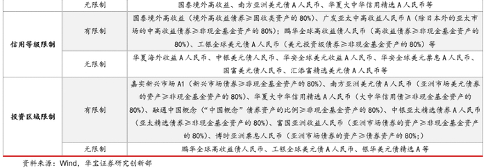 (4)信用等级限制:部分QDII债基会在基金合同中对所投资债券的信用等级进行限制。例如,鹏华全球高收益债人民币规定:投资高收益债券不得低于非现金基金资产的80%,广发亚太中高收益人民币A则对投资地区和信用等级同时做出规定:投资于除日本外的亚太市场的中高收益债券不得低于非现金基金资产的80%,此类基金我们定义为“有限制”。剩余QDII债基在基金合同中并未对投资标的的信用等级做出特殊约定,我们定义为“无限制”。