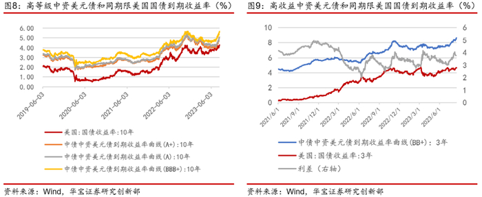 投资级中资美元债和高收益中资美元债收益率上行的影响因素不同。投资级中资美元债更多受美债利率上行因素影响,与美国国债收益率走势相关性高,近两年两者相关性在0.98以上。高收益级中资美元债以地产债为主,同时受到海外及境内双重影响,长期来看,高收益级中资美元债同样与美国国债收益率呈现较高相关度,但短期走势和利差更多受境内政策影响。