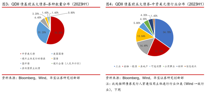 QDII债基投向:中资美元债也是QDII债基最青睐的券种,目前存续的25只QDII债基前五大重仓债券中均出现了中资美元债的身影。2023年二季报中,中资美元债数量占比达到55.20%,美国国债数量占比31.20%。