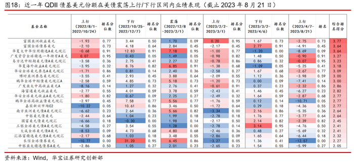 在经济基本面和美联储政策行为的综合作用下,过去1年10年期美国国债收益率整体呈现震荡上行,但是在此期间出现了明显的下行期和上行期,例如2023年2月因经济预期迅速升温推动美债收益率快速上行。考虑到QDII基金人民币份额受到汇兑损益影响,故评价基金运作业绩时仅使用美元份额,依照收益率变动趋势将过去1年划分为6个阶段,计算每个区间内QDII基金美元份额的区间收益率和相对排名分位,并进行加总得到综合排名得分。