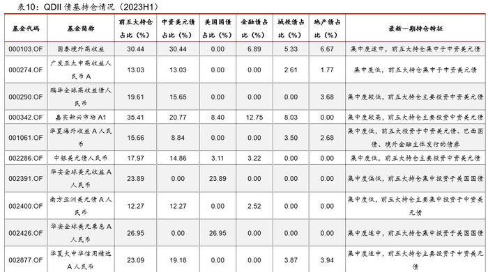 (1)持债集中度:我们将QDII债基前五大重仓债券占比之和定义为持债集中度,根据QDII债基近四期(2023H1、2023Q1、2022、2022Q3)持债集中度均值进行进一步分类:其中,“持债集中度均值≥30%”为“高集中度”,“20%≤持债集中度均值<30%”为“集中度适中”,“持债集中度均值<20%”为“低集中度”。由于QDII债基仅披露前五大持仓,因此下文分析仅限于QDII债基前五大持仓,存在一定局限性。