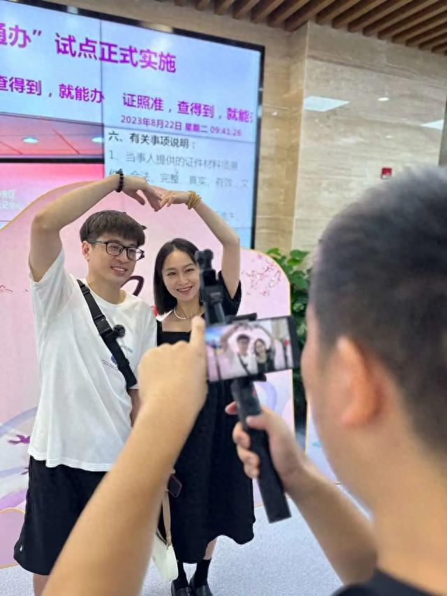 记者在现场也发现,当天不少新人特意穿上了传统汉服或者中式旗袍前来领证,更多人也选择了在中式颁证大厅里宣读结婚誓言。
