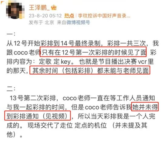 整篇微博很长,简单概括一下就是,在彩排期间,节目组故意安排王泽鹏和李玟无法同时见面,并安排了王泽鹏全程背对李玟走位,并被告诫不准回头。