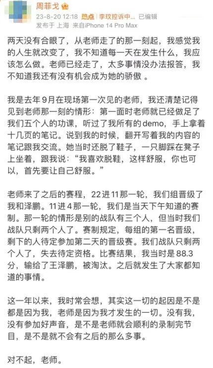而在同一天,另一位学员周菲戈,也就是那位88.3分却被“淘汰”的当事人,也通过一篇长文证实了那则李玟怒斥赛程不公视频的真实性。