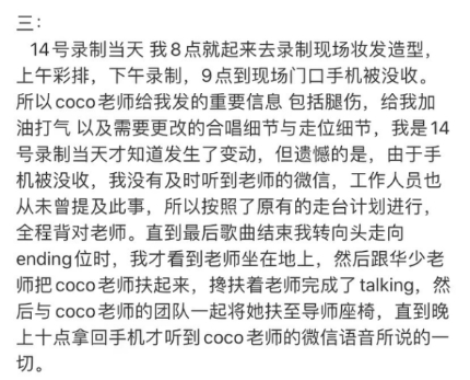 表演当天,他们更是早早收了王泽鹏的手机,让他无法得知李玟更改的走位细节和需要搀扶完成表演的讯息,只能按照彩排走位,最终导致了李玟的摔倒。