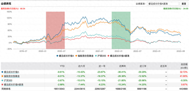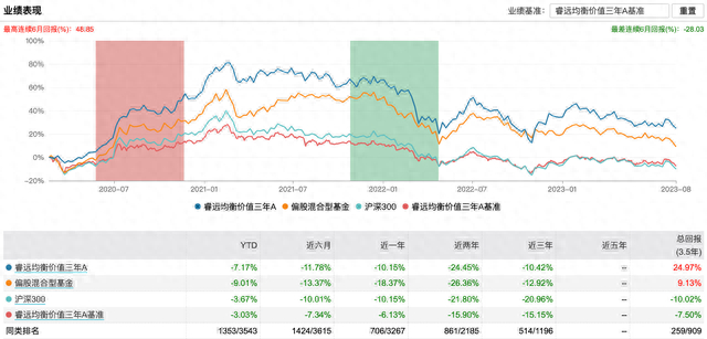 Wind数据显示,截至8月21日,睿远成长价值A年内收益率为-9.61%,近一年与近三年收益率均为负值,分别为-23.87%、-30.29%,均跑输业绩基准,在同类产品中排名位居后四分之一的位置。