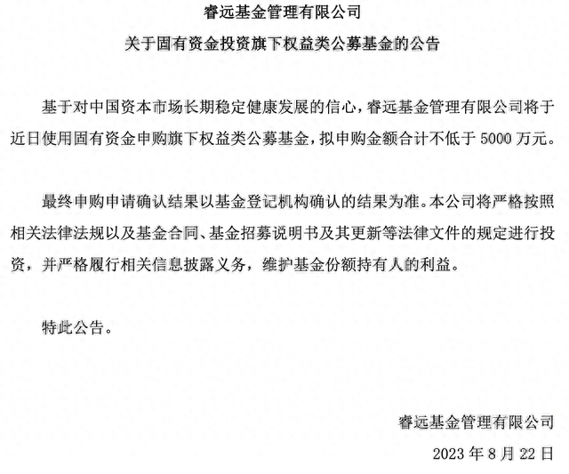 8月22日晚间,睿远基金再发布公告称,基于对中国资本市场长期稳定健康发展的信心,公司将于近日使用固有资金申购旗下权益类公募基金,拟申购金额合计不低于5000万元。