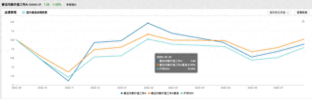 具体来看近一年的基金净值数据,睿远均衡价值三年A在2022年11月触及近一年的最低点,此后开始震荡调整并有所回升,截至今年7月底,该只基金A的净值为1.33。
