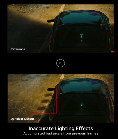 这个步骤正是DLSS 3.5最重要的更新。过去填补像素的降噪器是由人工设计的,通过在多帧中依时累积像素,或对原始图像进行空间插值来补全高分辨率图像。在此过程中,存在引入鬼影、消除动态效果并降低其他效果的风险。
