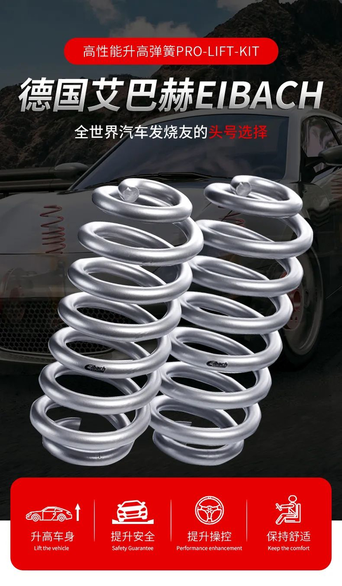 俗称的升高弹簧,Eibach(艾巴赫)也给部分越野/SUV车型出了升高弹簧,这个弹簧是介于街道和越野之间的弹簧,在升高最高30mm的同时,提高车辆的行驶品质,是非常具有性价比、也是极具效率的一种提升方式。