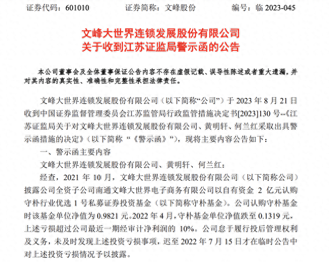 决定书显示,经查,2021年10月,文峰股份披露公司全资子公司文峰电商以自有资金2亿元认购守朴优选1号。公司认购守朴优选1号时该基金单位净值为0.9821元。但是,2022年4月,守朴基金单位净值跌至0.1319元,上述亏损超过公司最近一期经审计净利润的10%。