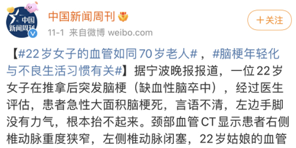 据新闻报道,前不久一名年轻女子在按摩后突然发生脑梗(缺血性脑卒中)。经过医生检查,该患者右侧的椎动脉十分狭窄,左侧的椎动脉出现堵塞现象,颈部的血管竟和70岁老人相差无几,这让人难以想象。