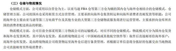 在仓储模式方面,公司采用以自营仓为主、以 亚马逊 FBA仓等第三方仓为辅的国内仓与海外仓相结合的仓储模式。仓储管理方面,公司的国内仓采用租赁方式自营管理,主要承担向海外仓集货转运和向海外消费者直邮发货等职能;公司的海外仓主要由亚马逊等第三方电商平台及其他专业的大型第三方 仓储物流 服务商进行运营管理,主要承担向仓库所在国的消费者配送商品的职能。