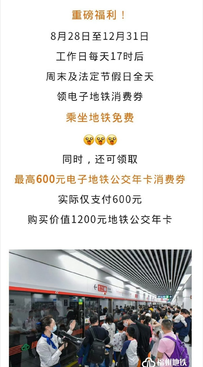 “8月28日至12月31日期间,福州地铁开展领电子消费券享夜间、周末及节假日免费乘地铁活动;市民还可以领取电子地铁公交年卡消费券,享受购买地铁公交年卡的优惠。”微信公众号“福州地铁”近日表示。