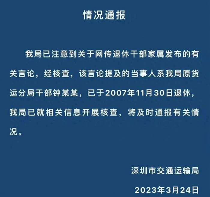 比如今年3月22日“北极鲇鱼”事件,在国外留学的钟姓女子不仅炫富,还用恶毒言论讥讽国人,并牵出了其已从深圳市交通局退休的爷爷。当时,深圳市交通局就发出了“开展核查,将及时通报有关情况”的情况通报。此后,深圳市纪委也发布了公告。