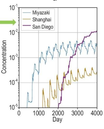 这三地的污染物浓度一开始快速上涨,后期逐渐稳定。2000天后,宫崎附近的污染物浓度基本在每立方米0.001个单位以上。但到4000天之时,圣迭戈附近海域的污染物浓度升至0.01,远高于宫崎和上海。