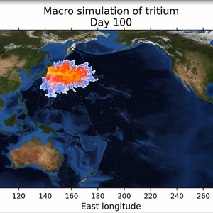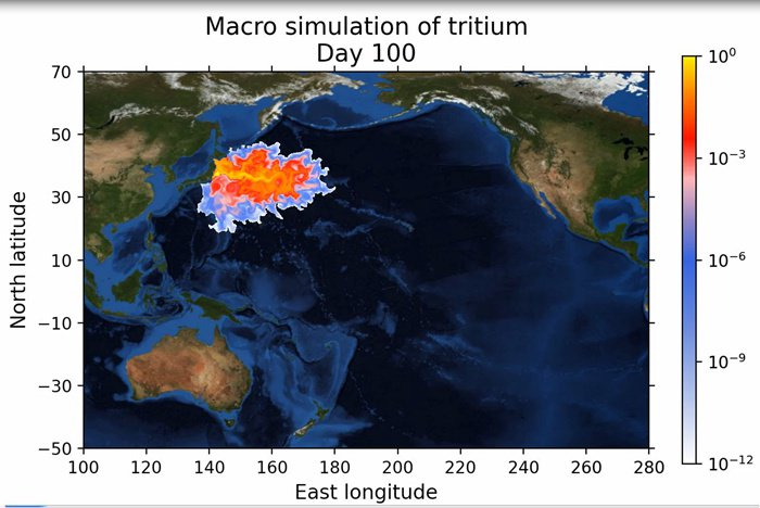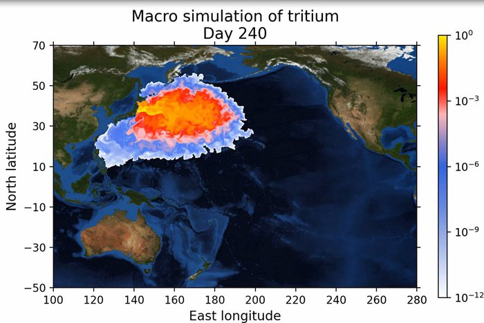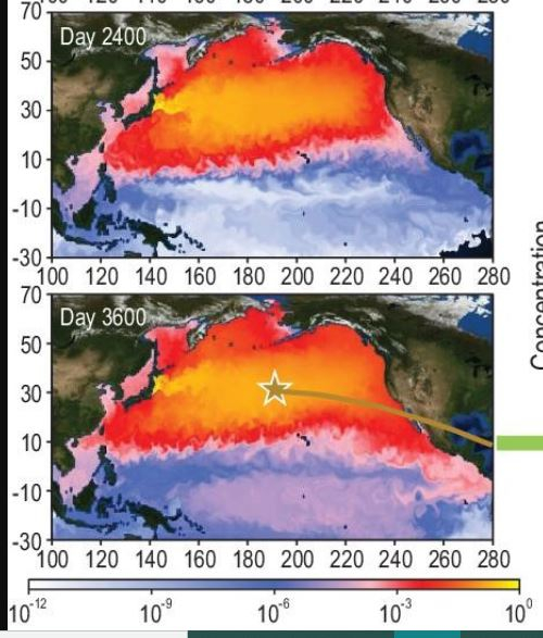 而受洋流影响,污染物在纬度上的扩散速度将快于经度上的扩散,污染物浓度最高地带将位于北纬35°附近。1200天(约3.3年)后,污染物将抵达北美西侧海域和澳大利亚北部海域,之后将覆盖几乎整个北太平洋地区。
