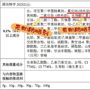 市面上多数防晒化妆品为物理化学结合的防晒产品,下图为此类产品的签示。