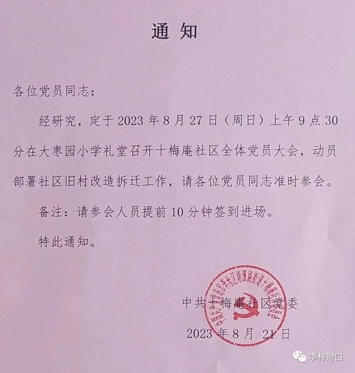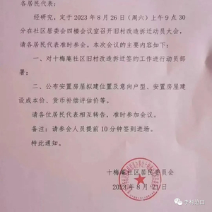 十梅庵社区居委会通知,2023年8月26日(本周六)上午9点30分,在社区居委会四楼会议室召开旧村改造拆迁动员大会。本次会议主要内容包括:对十梅庵社区旧村改造拆迁签约工作进行动员部署;公布安置房拟建位置及意向户型、安置房屋建设成本价、货币补偿评估价等。