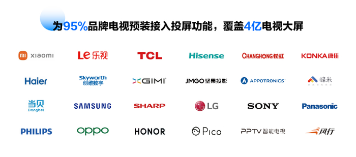 为众多主流手机品牌接入投屏功能,实现开机自启动,累计覆盖10亿手机设备,包括但不限于小米、OPPO、vivo、中兴……
