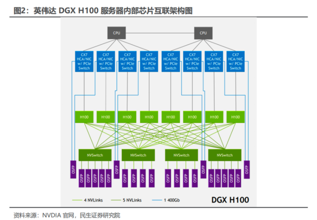 以 NVIDIA HGX H100 8-GPU为例,8 块 H100 GPU在全新的 FP8 精度下 AI 性能比上一代高 6 倍,可提供 900GB/s 的带宽,该服务器内部包含NVLink、PCIe和QPI等主板总线。