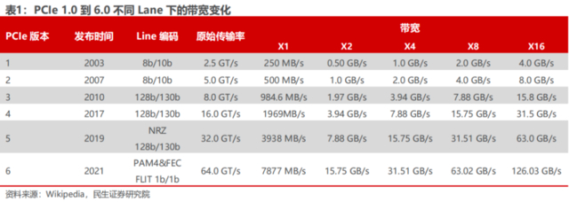 PCIe最早由Intel于2001年提出,2003年正式推出PCIe 1.0版本,到2022年已迭代至6.0。根据PCI-SIG官网,伴随人工智能、自动驾驶、AR/VR等具有高运算要求的应用快速发展,处理器I/O带宽每三年实现翻番,也促使PCIe基本上按照3年一代的速度更新演进。