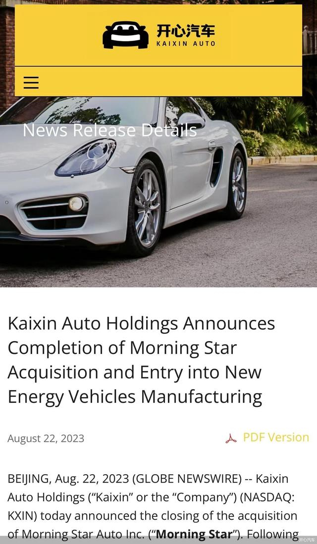 开心汽车的造车长跑,闯过第一打卡点。8月22日晚,开心汽车宣布并购MORNING STAR AUTO INC.(以下简称“茂林斯达”)完成交割,茂林斯达成为开心汽车全资控股子公司,由此开心汽车正式进军新能源汽车制造领域。开心汽车董事长兼CEO林明军表示:“公司在新能源汽车转型经历较长时间周期,今天交割是开心汽车转型成功重要里程碑。”