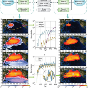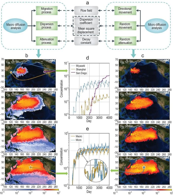 模拟结果表明,核污水在排放后240天就会到达我国沿岸海域,1200天后将到达北美沿岸并覆盖几乎整个北太平洋。随后,污染物一边在赤道洋流的作用下沿着美洲海岸向南太平洋快速扩散,另一边通过澳大利亚北部海域向印度洋转移。