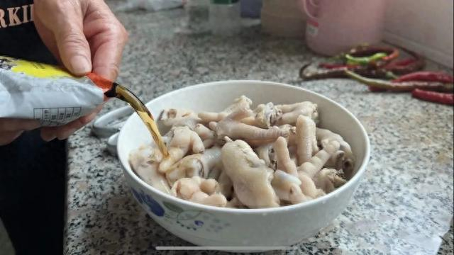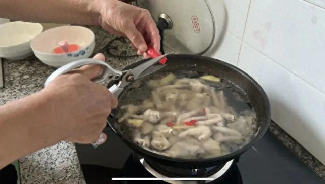 虽然制作糟卤鸡爪并不难,但要想做得好吃,沈文英有着自己的“秘方”。先将鸡爪仔细清洗,用剪刀剪去指甲,再用刀剁成小块以便更好地入味。“给鸡爪焯水的时候,我会加上一些自家种的朝天椒,去腥的同时还能让鸡爪带点鲜辣味。”