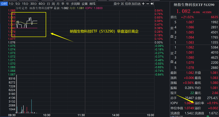 值得注意的是,今日早盘纳指生物科技ETF(513290)溢价高企,反映买盘力道强劲,资金布局意愿强烈!