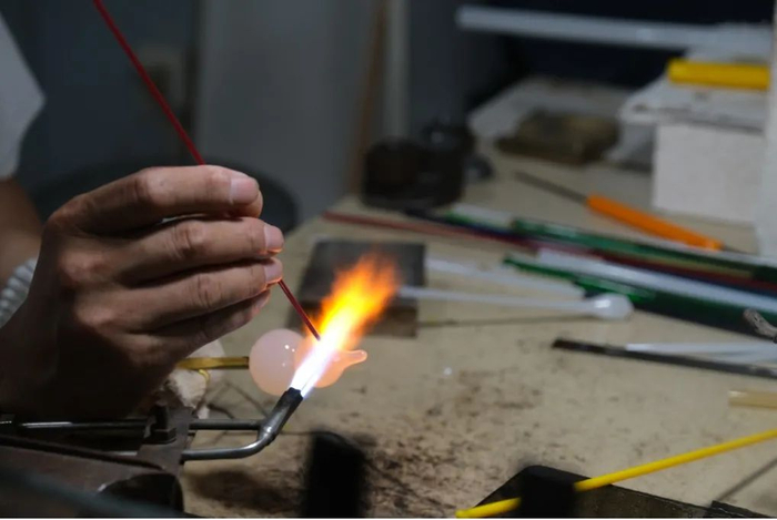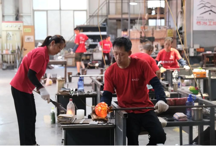 在山东西冶琉璃文化艺术有限公司(以下简称“西冶工坊”)制作车间内,《金融时报》记者看到,不畏高温的琉璃工匠们,手握一支细长的铁管,探入温度高达上千摄氏度的炉火中,挑出一团炙热滚烫的液态琉璃,赶在凝固前争分夺秒地通过吹、塑、展、粘、捻、拉等技法,针对不同主题给予理想中的造型创作,动作之迅速、手法之娴熟,令人称叹。