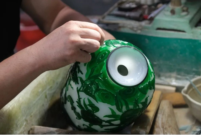 在蔚为关键的吹泡工序中,匠人需要向吹管内吹气,形成正向气压,通过吹管的传导作用,使得另一端的玻璃料膨胀成一个玻璃泡,且每次取料之后匠人都需要进行吹泡,一次次吹泡过后,才能促使琉璃泡从起初的乒乓球大小逐渐变成40公分左右的大花瓶,这一环节依靠的正是匠人强大的肺活量,在高温作业的环境下,此番劳作既考验功力与耐力,同样离不开匠人的巧劲与心思。