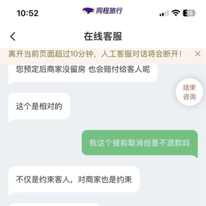 同城旅行线上客服回答酒店能否退款事宜