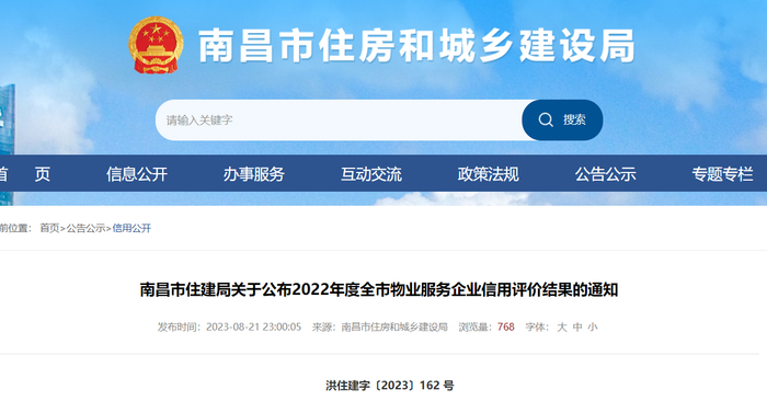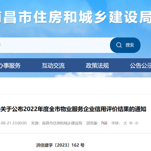 南昌市住房和城乡建设局关于公布2022年度全市物业服务企业信用评价结果的通知