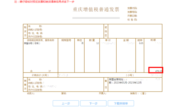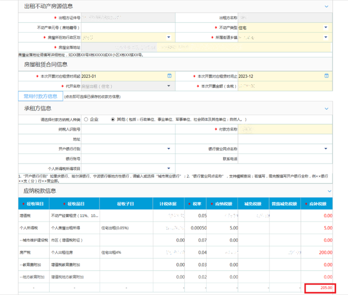 计算税款信息。根据自然人所出租的不动产类型、开票金额、代开发票的种类等,系统会自动计算所需缴纳的税款。这里以代开普票为例进行展示。