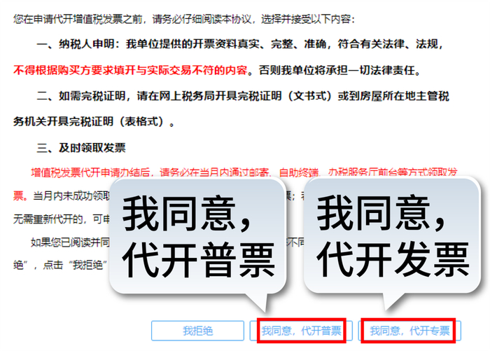 根据实际需求,选择【我同意,代开普票】或【我同意,代开专票】。