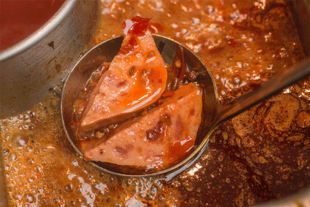 然后再打成肉糜,期间只加入少量食盐和玉米淀粉,腌制成熟后,高压无菌灌装。