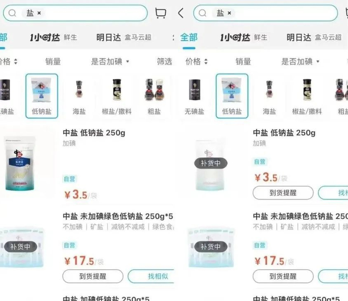 8月24日中午,记者查看生鲜电商平台发现,多个平台的低钠盐、无碘盐显示“缺货” “补货中”。“盒马的一款低钠盐一分钟前看还有货,再一滑就显示缺货了。”一位消费者表示。