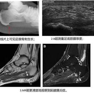 此外,辅助检查有助于进一步明确足底筋膜炎的疼痛点,并有助于与其他全身性疾病引起的足底疾病鉴别。常见的检查方式有X片、B超、足部MR等,提示患者足部的骨刺增生、筋膜增厚或炎症等。