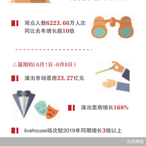 演出市场活跃的暑期,票房成绩单也同样精彩。据灯塔专业版,暑期档(6月1日-8月8日),演出市场票房23.27亿元,较疫情前2019年同期,演出观演人次翻倍,演出票房增长168%。livehouse场次较2019年同期增长3倍以上,观演人次是2019年同期的8倍。