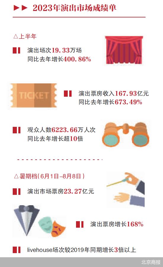 春节以来持续复苏的演出市场,在这个暑假继续升温。演唱会一票难求,音乐节百余场陆续官宣,话剧、舞剧、音乐剧名家汇集、连连加场。数据显示,2023年上半年,全国营业性演出(不含娱乐场所演出)场次19.33万场,同比增长400.86%;演出票房收入167.93亿元,同比增长673.49%;观众人数6223.66万人次,同比增长超10倍。而演出经济的火热不仅反映在票房等直观收入上,还成为拉动地区消费的新引擎,跨城观演成为大型演唱会、音乐节的新趋势,一站式文化空间概念进一步强化,沉浸式演出等演出新业态、演出+文创、演出+咖啡等新业务雨后春笋般进入市场。不同于房子、车子等大宗消费,强劲复苏、供需双旺的“小宗消费”,也在为市场持续注入活力。