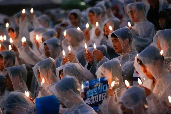 8月23日,在韩国首尔的国会议事堂前,韩国最大在野党共同民主党举行集会抗议日本政府决定启动核污染水排海/新华社记者 王益亮 摄