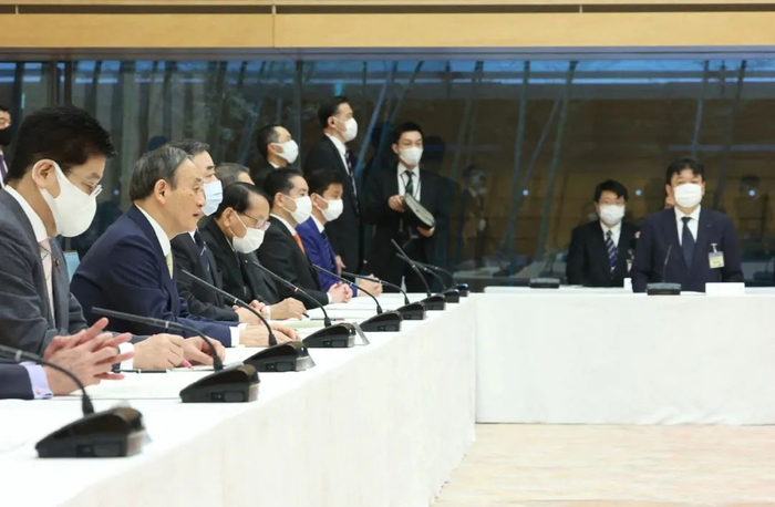 当地时间2021年4月13日,日本东京,日本政府召开阁僚会议,正式敲定将福岛第一核电站核废水排放入海的方针,左二为菅义伟