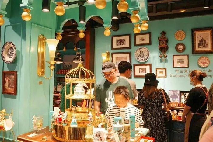 在布兰兔的植物庄园,门口身着燕尾服的布兰兔立式玩偶对游客发出“童话世界邀请函”,芬芳弥漫的花果茶香、琳琅满目的欧式茶具,对游客而言都是难以抗拒的伴手礼选项。“平时我们日平均客流量能达到1000人次以上。”该门店工作人员说道。布兰兔的植物庄园作为新式茶饮品牌的佼佼者,已入驻杭州、上海、南京、深圳、广州、长沙、苏州等各大城市,南浔古镇门店为湖州市首家品牌入驻店铺。