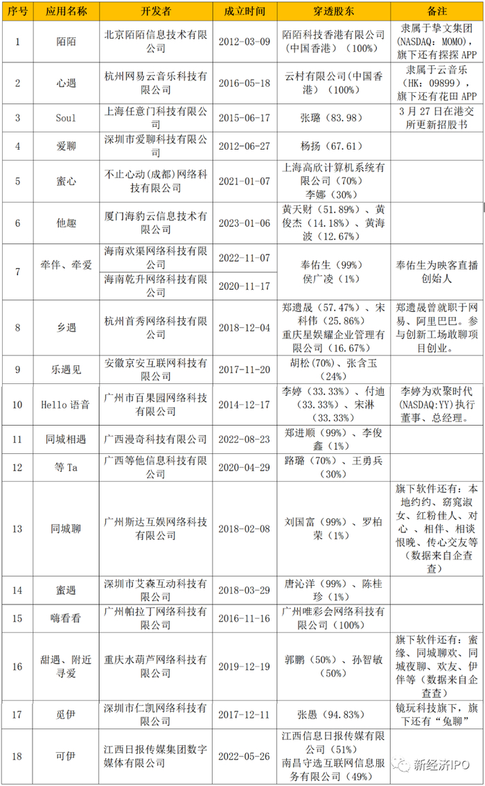 新经济IPO注意到,牵伴APP、牵爱APP的开发者分别为海南欢渠网络科技有限公司、海南乾升网络科技有限公司。但穿透发现,牵伴APP、牵爱APP的背后股东均为奉佑生(99%)、侯广凌(1%)。