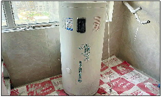 8月21日,帮办记者来到甲第壹号小区,见到了业主反映的热水器储水箱。开发商给业主提供的是山东某品牌太阳能热水器,储水箱的额定容量为100升,如庞然大物般悬挂在阳台的墙上十分惹眼。