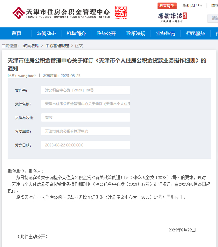 8月22日,天津市住房公积金管理中心连发两则通知,对《天津市住房公积金提取业务操作细则》《天津市个人住房公积金贷款业务操作细则》进行修订,自2023年8月25日起施行。